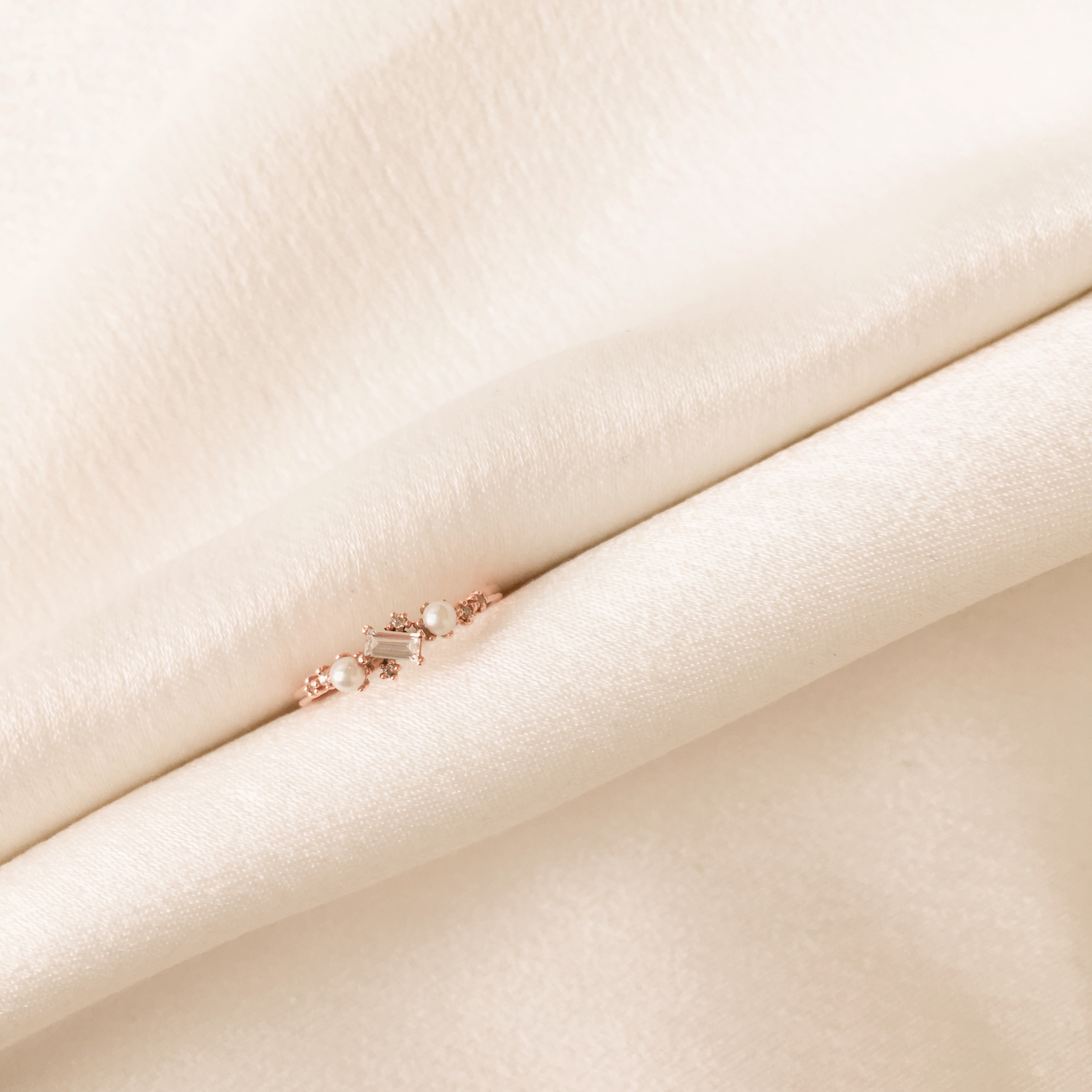 요정을 닮은 트윈 담수 진주와 스퀘어 컷 큐빅이 세팅된 반지입니다.